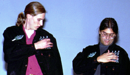 At the Media Lab, we have recently built "Musical Levi's Jackets", with a touch-sensitive MIDI keyboard embroidered directly into the fabric using conductive thread. The video clip (11.8 MEG MPEG) shows PhD student Josh Smith demonstrating the jacket outside the Media Lab. The thread, embroidered into a standard 4 x 3 character keypad below the right shoulder, contains stainless steel filaments, making it conductive. The capacitive loading of the body is detected when the thread is touched; the keypad is polyphonic, thus several keys can be hit simultaneously. Sound is generated by a single-chip General MIDI wavetable synthesizer (made from Crystal Semiconductor of Fremont, CA), and sequences are generated in a PIC16C84 microcontroller made by Microchip Technology (Tempe, Arizona). In this demonstration, different notes are on different keys, with the exception of the lower keys, which change modes. A "0" turns on a percussion sequence (other keys play drum sounds in accompaniment); the * and # keys speed and slow the tempo. Another "0" keeps the percussion sequence going, but causes the keypad to now play tonal "voiced" sounds; the instrument chosen can be changed by pressing the * and # keys. The jacket is entirely battery operated, with powered speakers in the pockets. The keypad was designed by Maggie Orth and Rehmi Post, and the MIDI hardware/software was concocted by Josh Strickon and Josh Smith. Rehmi and Josh Smith can be seen demonstrating the jackets in the above photo.
